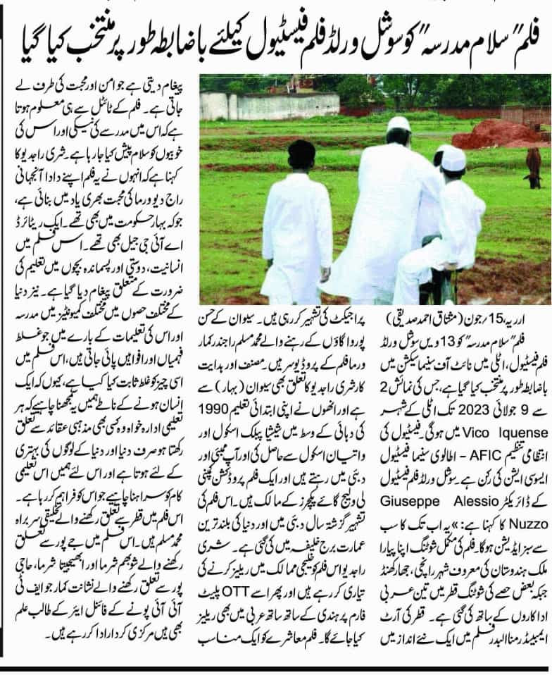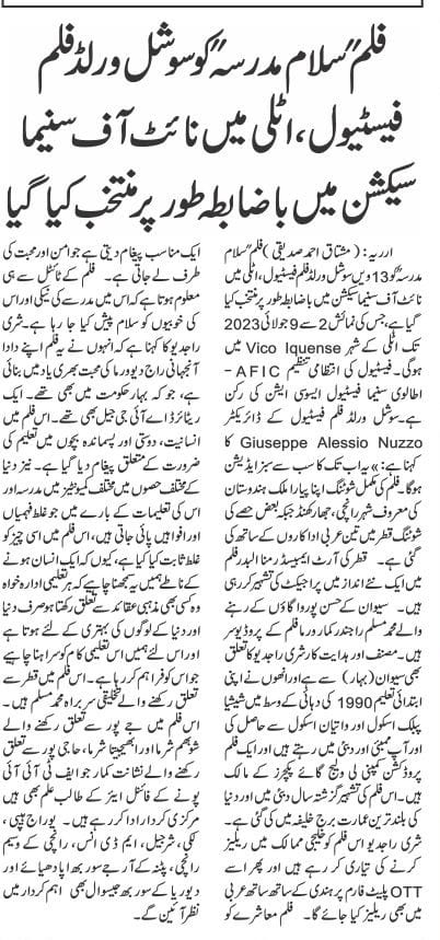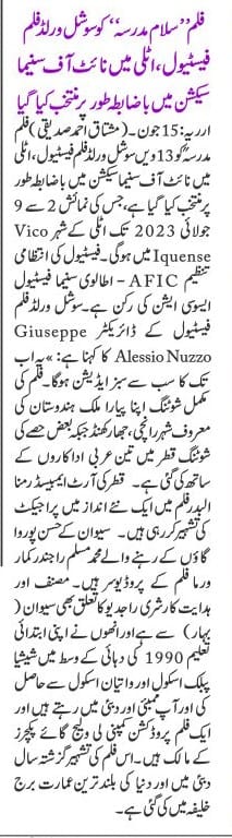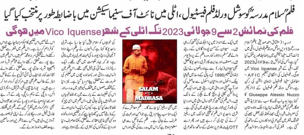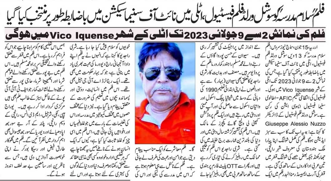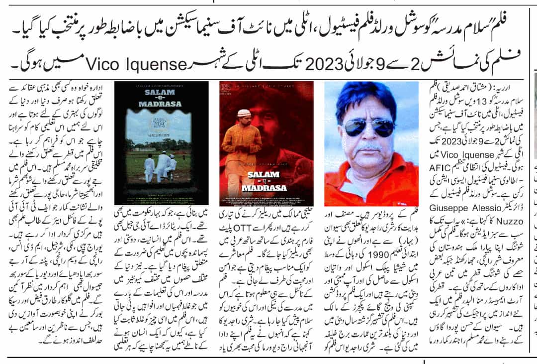 "Feature film Salaam e Madarsa has been officially selected in the Night of Cinema section at the 13th edition of Social World Film Festival, Italy.